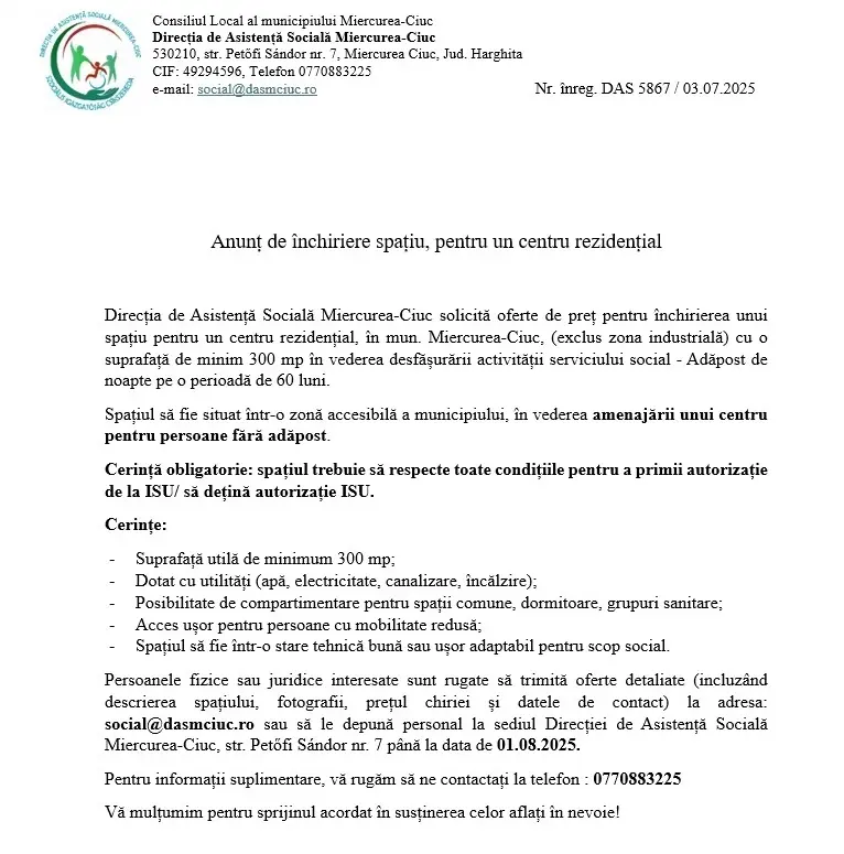 Anunț de achiziție directă a serviciilor sociale prestate ca centre de zi pentru persoane adulte cu dizabilități în Miercurea-Ciuc.